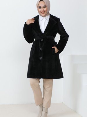 İmajbutik Siyah Kruvaze Yaka Astarlı Cepli Kaşe Kaban