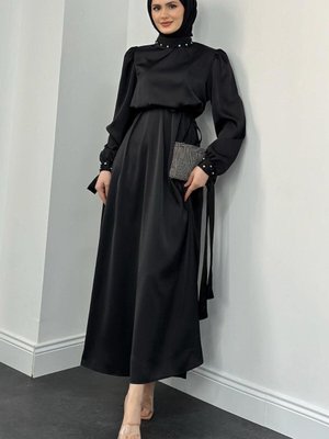 Mervenakyuz Lupin Kolu Ve Boynu Taşlı Abiye Elbise Siyah