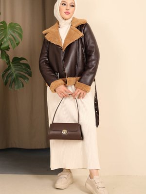 İmajbutik Kahverengi İçi Peluş Kısa Deri Mont