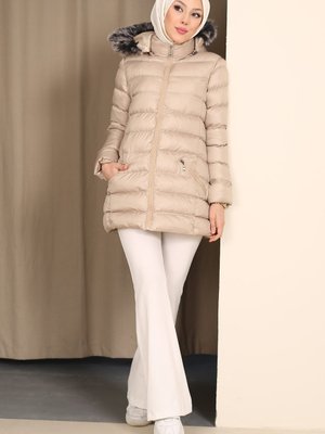İmajbutik Bej Kapüşonlu Fermuarlı Kısa Şişme Mont