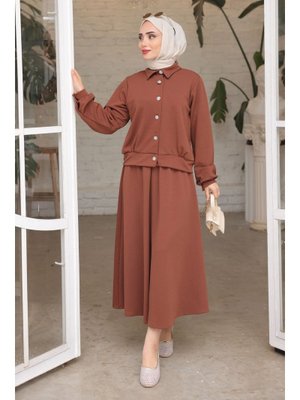 İmaj Butik Kahverengi Düğme Detaylı Etekli Takım