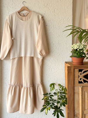 Ceylan Otantik Krem Eteği Fırfırlı Elbise & Bağlamalı Triko Süveter