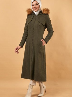 Modamihram Haki Fermuarlı Kapüşonlu Kaşe Kaban