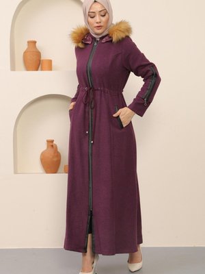Modamihram Mürdüm Fermuarlı Deri Detaylı Kaşe Kaban