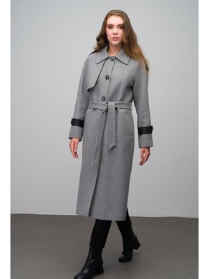 Olcay Gri K Gerçek Deri Detaylı Belden Bağlamalı Ara Boy Kaşmir Kaban