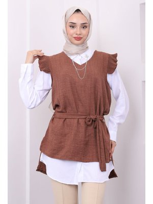 İmaj Butik Kahverengi Kemerli Tunik Gömlek Kombin İkili Takım