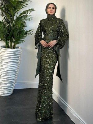 Merven Akyüz Firida Pul Payet Balık Abiye Elbise Haki