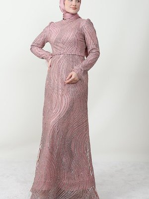 Giz Astore Kendinden Kemerli Pullu Abiye Elbise Pudra