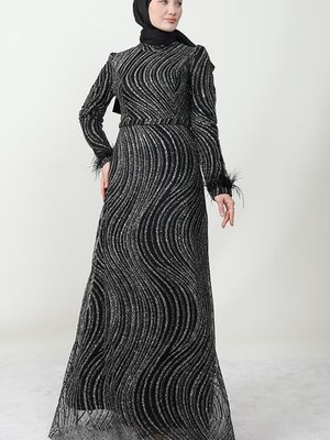 Giz Astore Kendinden Kemerli Pullu Abiye Elbise Siyah