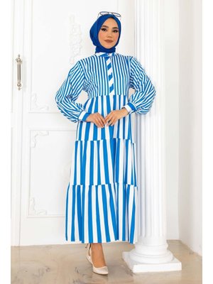 Benguen Mavi Çizgili Saten Elbise