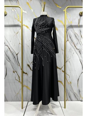 Hakimoda Siyah Saren Saten Abiye Elbise