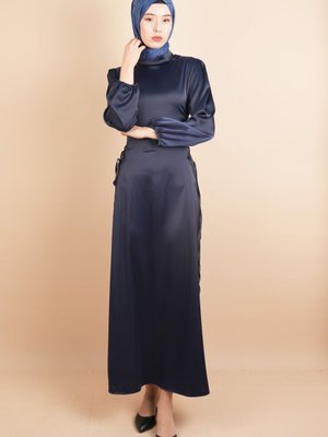 03kızkulesıteks Yandan Çapraz Bağlamalı Saten Abiye Elbise Lacivert