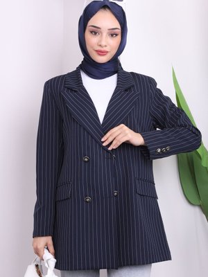 İmajbutik Lacivert Kruvaze Yaka Çizgili Ceket
