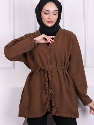 İmajbutik Kahverengi Bel Kuşaklı Saç Örgülü Ceket