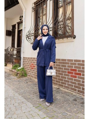 Locco Moda Lacivert Yaka Detaylı Kuşaklı İkili Takım