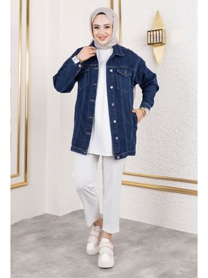 Tesettür Dünyası Koyu Mavi Düğmeli Klasik Kot Ceket