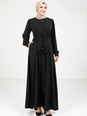 Beyza Siyah Bağlama Detaylı Fermuarlı Ferace