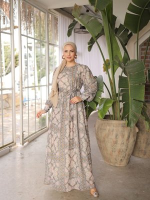 Nissra Bej Kol Manşetli Kare Desenli Şifon Elbise