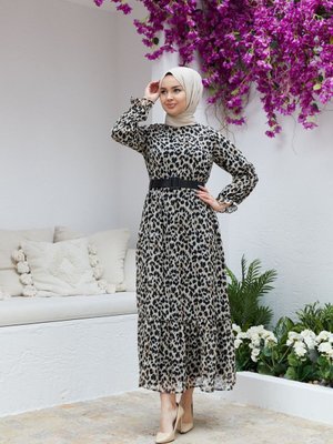 Nissra Leopar Eteği Büzgülü Rahat Kesim Şifon Elbise