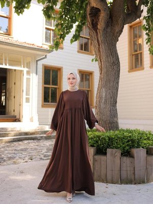 Nissra Kahverengi Ankanoor Balon Kollu Oversize Elbise