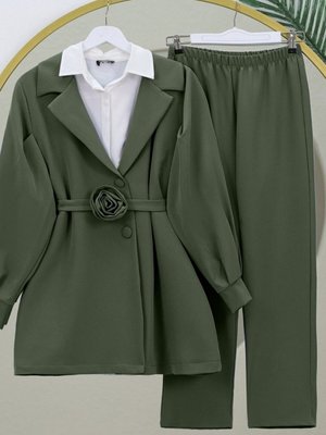 HİJABAYA Haki Kemeri Gül Detaylı Kruvaze Yaka Ceket Pantolon İkili Takım