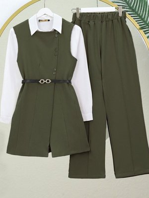 HİJABAYA Haki Kemerli Düğmeli Uzun Yelek
