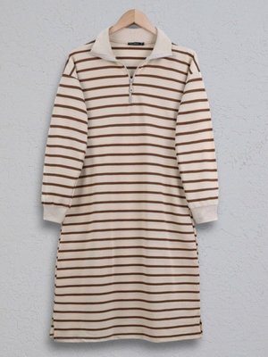 HİJABAYA Kahve Yarım Boğazlı Yakası Fermuarlı Çizgili Tunik