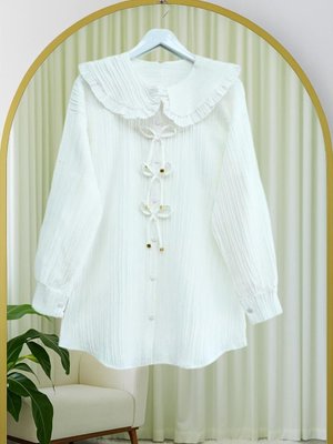 Podyumplus Beyaz Önü Kurdele Detaylı Düğmeli Önlük Yaka Gömlek