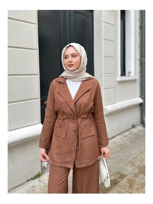 Volt Clothing Kahverengi Bel Büzgülü Keten Ceket Pantolon Takım