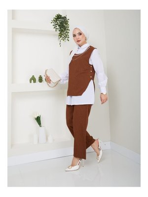 Volt Clothing Kahverengi Kadın Kolye Detay Gömlek Yaka Çizgili Üçlü Yelekli Takım