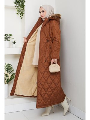 Harmatime butik Uzun İçi Kürklü Kapişonlu Turuncu Kapitone Mont