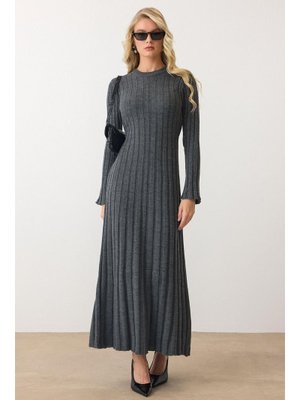 Olcay Gri E Bisiklet Yaka Kalın Fitilli Uzun Triko Elbise