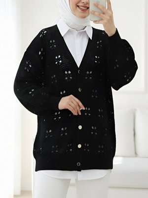 Podyumplus Siyah Düğmeli Ajurlu Araboy Triko Hırka