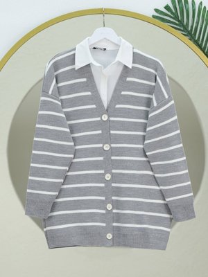 Podyumplus Gri Çizgili Düğmeli V Yaka Triko Hırka