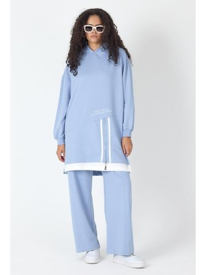 BASICPARK İndigo Etek Süpremli Baskı Detaylı Fermuar Kapamalı Kapüşonlu Pamuklu Örme Alt Üst Takım