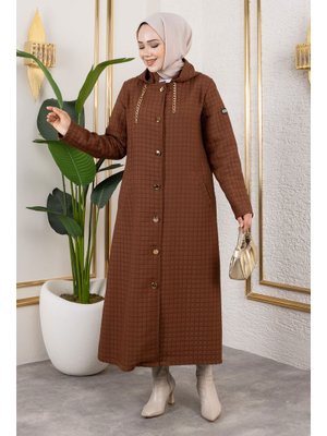 Tesettür Dünyası Kahverengi Kapüşonlu Zincir Detaylı Kapitone Kap