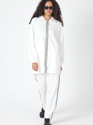 BASICPARK Ekru Fermuar Kapamalı Şerit Detaylı Gömlek Yaka Pamuklu Örme Alt Üst Takım
