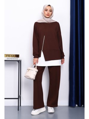 İmaj Butik Kahverengi Fermuar Detaylı Modal Tunik Pantolonlu Takım