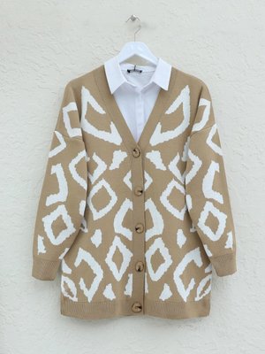 Podyumplus Vizon Düğmeli Desenli V Yaka Triko Hırka