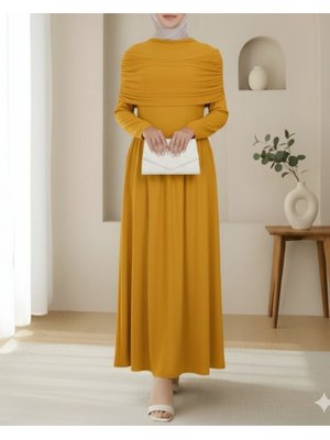Podyumplus Sarı Pile Detaylı Uzun Sandy Elbise