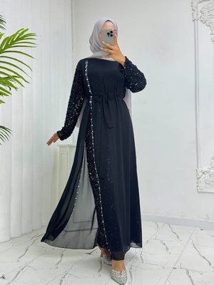 Podyumplus Siyah Kolları Pul Payet Kemerli Şifon Abiye Elbise