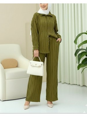 Podyumplus Yağ Yeşili Dokulu Düğmeli Dikey Şeritli Pantolon Gömlek Takım
