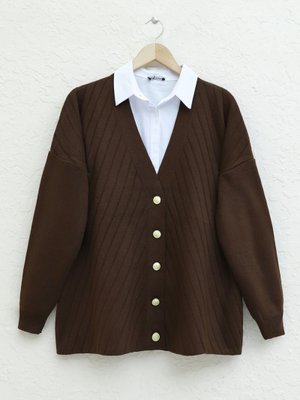 Podyumplus Kahve Çapraz Çizgili Broş Düğmeli Triko Hırka