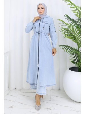 MODAMİHRAM Buz Mavisi Kapüşonlu Beli Bağcıklı Kot Takım