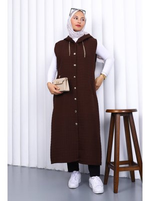 İmaj Butik Kahverengi Kapüşonlu Kapitone Uzun Yelek