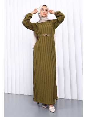 İmaj Butik K. Yağyeşili Beli Kemerli Fırfır Detaylı Gofre Elbise
