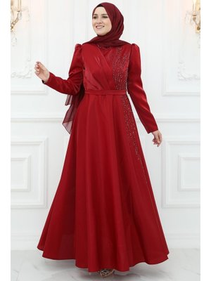 Amine Hüma Bordo Armağan Saten Abiye Elbise