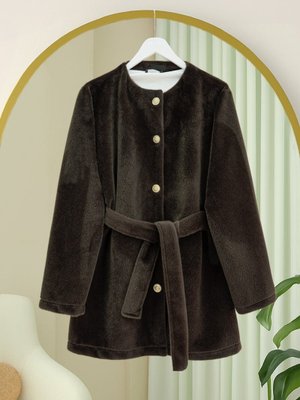 Podyumplus K. Kahve Düğmeli Beli Bağlamalı Kürklü Ceket