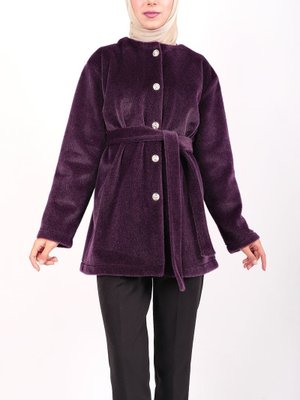 Podyumplus Mürdüm Düğmeli Beli Bağlamalı Kürklü Ceket