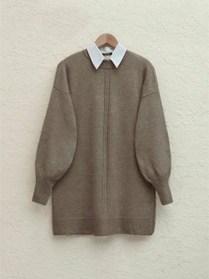 Podyumplus Toprak Bisiklet Yaka Balon Kol Şeritli Yumoş Kazak